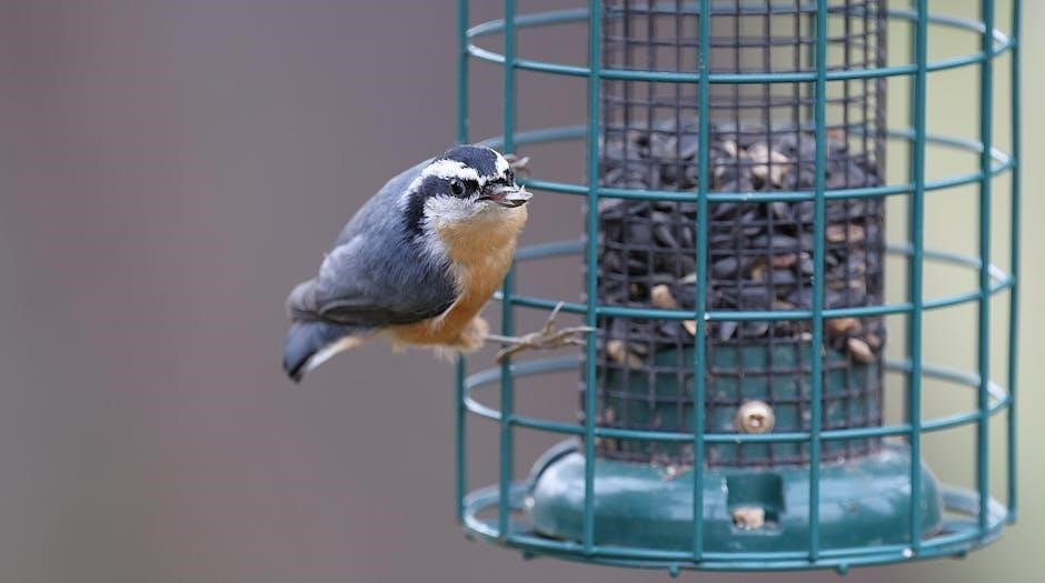 Position bird feeders in shaded areas to protect seeds from direct sunlight. Ensure the feeder is at least 3 feet above the ground to prevent predator access. Place it near trees or shrubs for birds to perch and feed safely. Avoid areas with strong winds to maintain stability. Proper installation ensures optimal performance and bird safety, enhancing the overall feeding experience for your feathered visitors while maintaining ease of maintenance.